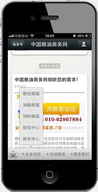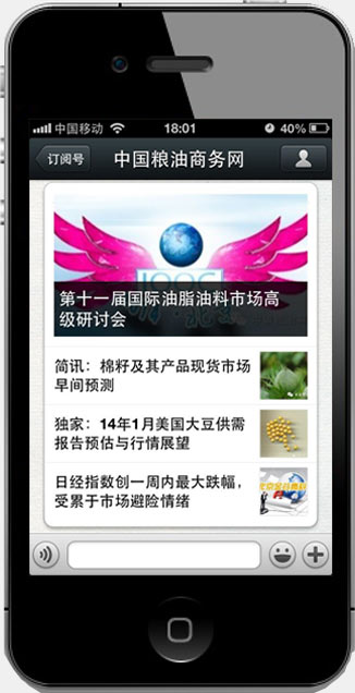 你们好,公司开通了2个微信公众号(订阅号和服务号),分别是微信订阅号和微信服务号,为您提供粮油、饲料、食品等农产品行业专业资讯服务,欢迎大家添加关注产品及信息行情!